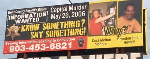 On May 24 th , 2006 Cora McAbee and Brandon Howell were murdered while they slept inside her residence located in the 3500 block of Private Road 2174. It has been confirmed that Cora and Brandon were in a relationship and had been for several months leading up to the night of their murders. Over the past 13 years the Hunt County Sheriffโ€™s Office has been investigating this case and following up on leads as they have come in but nothing of evidentiary value was located and no one has come forward with information pertinent to the case. The Hunt County Sheriffโ€™s Office is asking anyone with information on these murders to call Hunt County Crime Stoppers at 903-457-2929, you will remain anonymous and eligible for a reward.