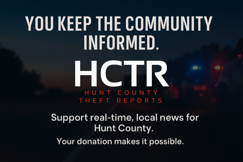 Hunt County Theft Reports provides 24/7 breaking news, weather alerts, scanner updates, and live on-scene coverage — completely free to the public. We’re not backed by big media or ad networks — we’re powered by you, the community.